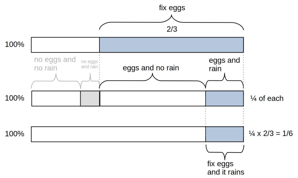 If two events are independent of each other, we can multiply the probabilities together. If you fix eggs for breakfast 2/3rds of mornings and it rains later in the day 1/4th of the time and whether you fixed eggs or not and it rains or not has no influence on each other (e.g., feeling like it might rain doesn’t cause you to be more or less likely to cook eggs) then we can calculate the probability of both occurring on a given day by multiplying the probabilities together.